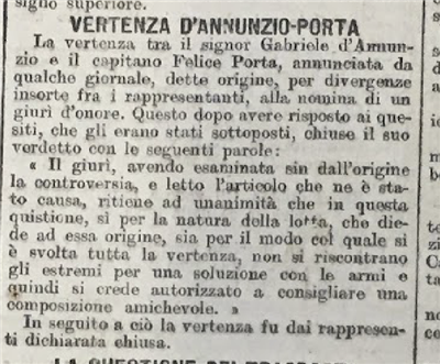 «La vertenza tra il signor Gabriele d'Annunzio e il capitano Felice Porta, annunciata da qualche giornale, dette origine, per divergenze insorte fra i rappresentati, alla nomina di un giurì d'onore. Questo dopo aver risposto ai quesiti, che gli erano stati sottoposti, chiuse il suo verdetto con le seguenti parole: - il giurì, avendo esaminato sin dall'origine la controversia, e letto l'articolo che ne è stato causa, ritiene ad unanimità che in questa quistione, sì per la natura delle lotte, che diede ad essa origine, sia per il modo col quale si è svolta tutta la vertenza, non si riscontrano gli estremi per una soluzione con le armi e quindi si crede autorizzato a consigliare una composizione amichevole. In seguito a ciò la vertenza fu dai rappresentanti dichiarata chiusa.»